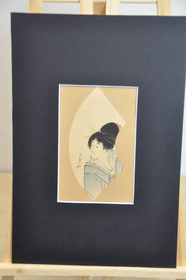 fan shaped Woodblock print with lady.