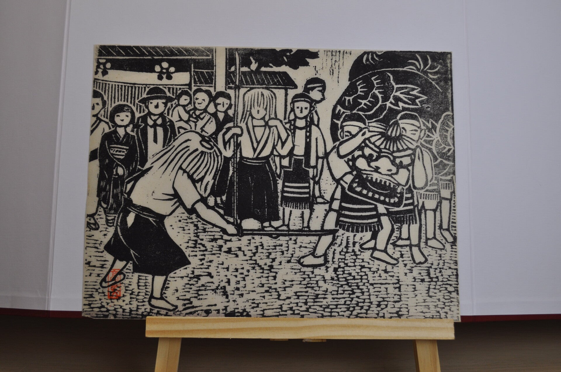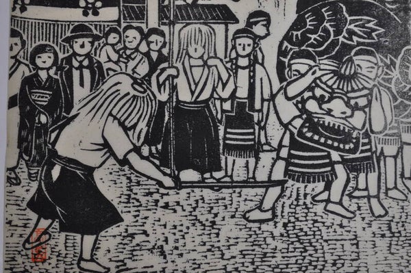 monochrome woodblock print.