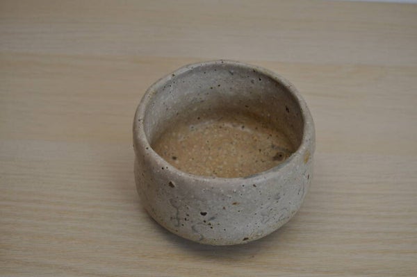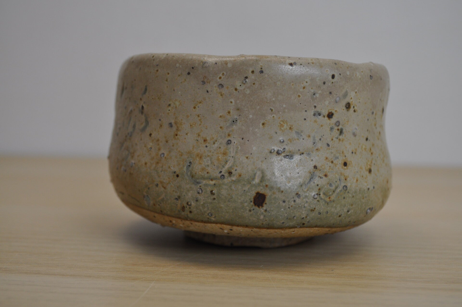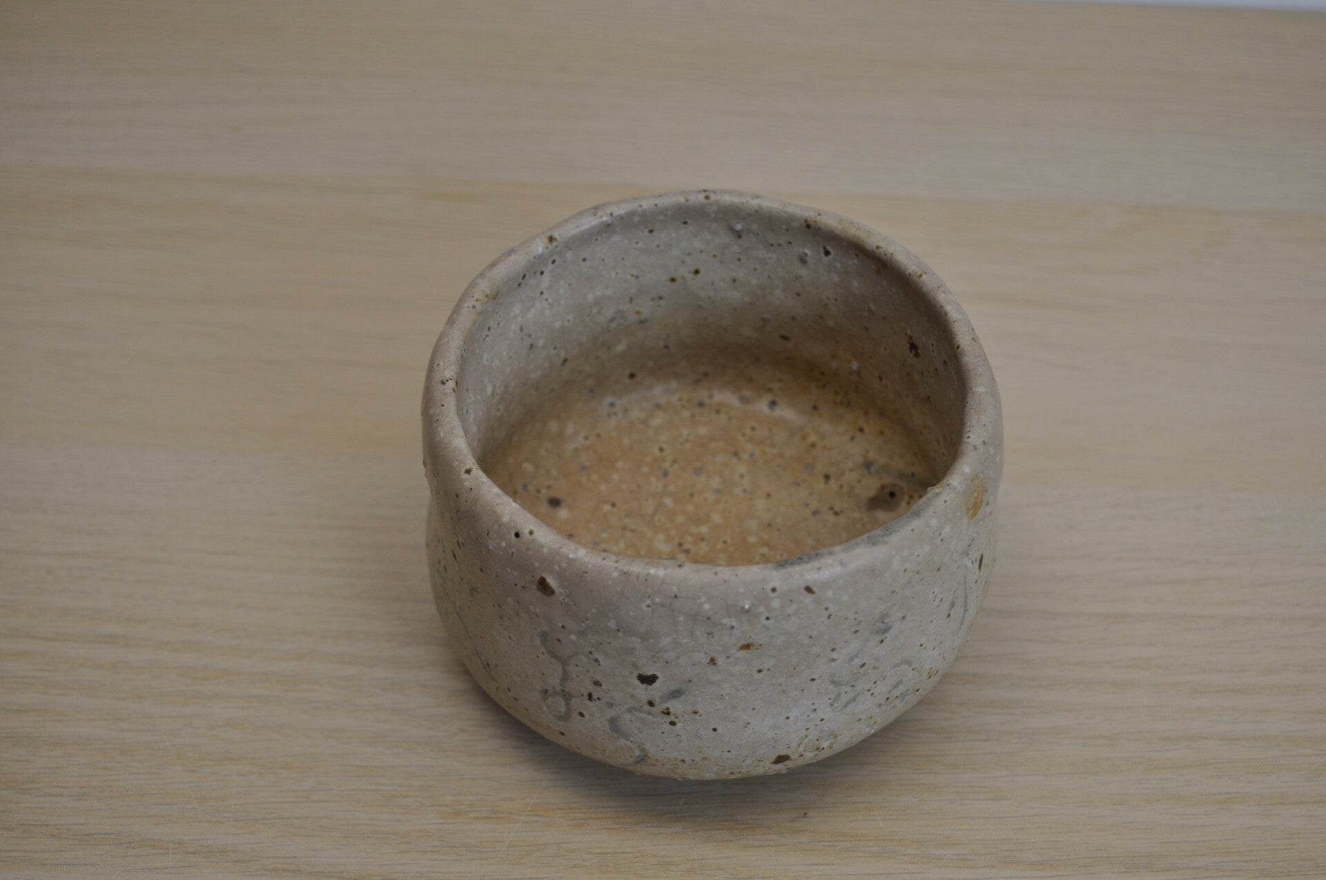 This elegant Shino-yaki (志野焼) matcha bowl reflects the rustic refinement of one of Japan’s most iconic ceramic traditions. The surface is finished in a soft, milky glaze with warm beige undertones, scattered with natural pinholes and subtle kiln freckles (yuzuhada 柚子肌, “citron skin”), a hallmark of Shino ware. Fine crackling (kan-nyū 貫入) across the glaze adds further depth and texture, creating a piece that embodies the beauty of imperfection.