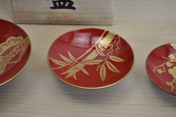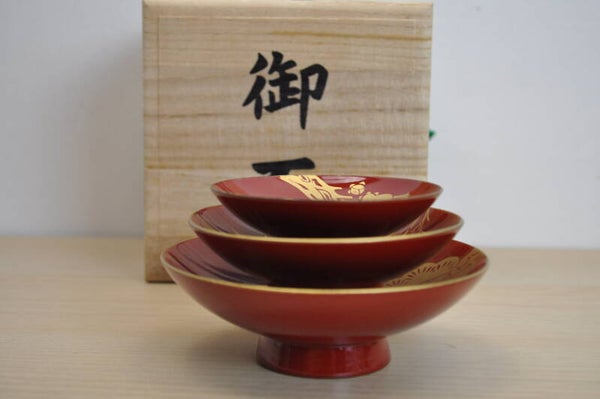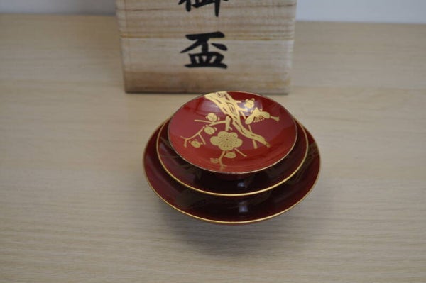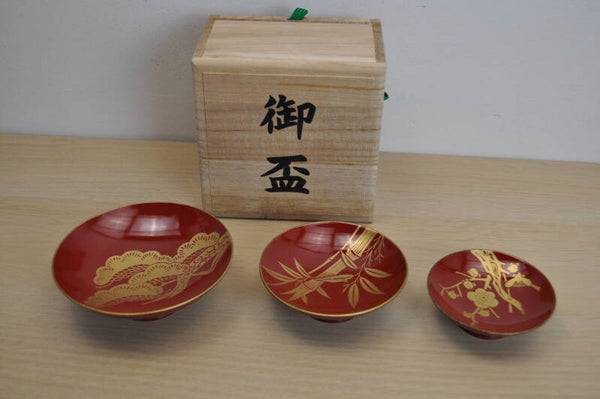 The set includes three red lacquer sake cups of different sizes, each adorned with elegant gold designs representing auspicious motifs in Japanese culture: Pine tree (松 / matsu): Symbol of longevity and resilience. Bamboo (竹 / take): Represents strength and flexibility. Plum blossom (梅 / ume): A sign of perseverance and renewal, as it blooms even in the cold of winter.