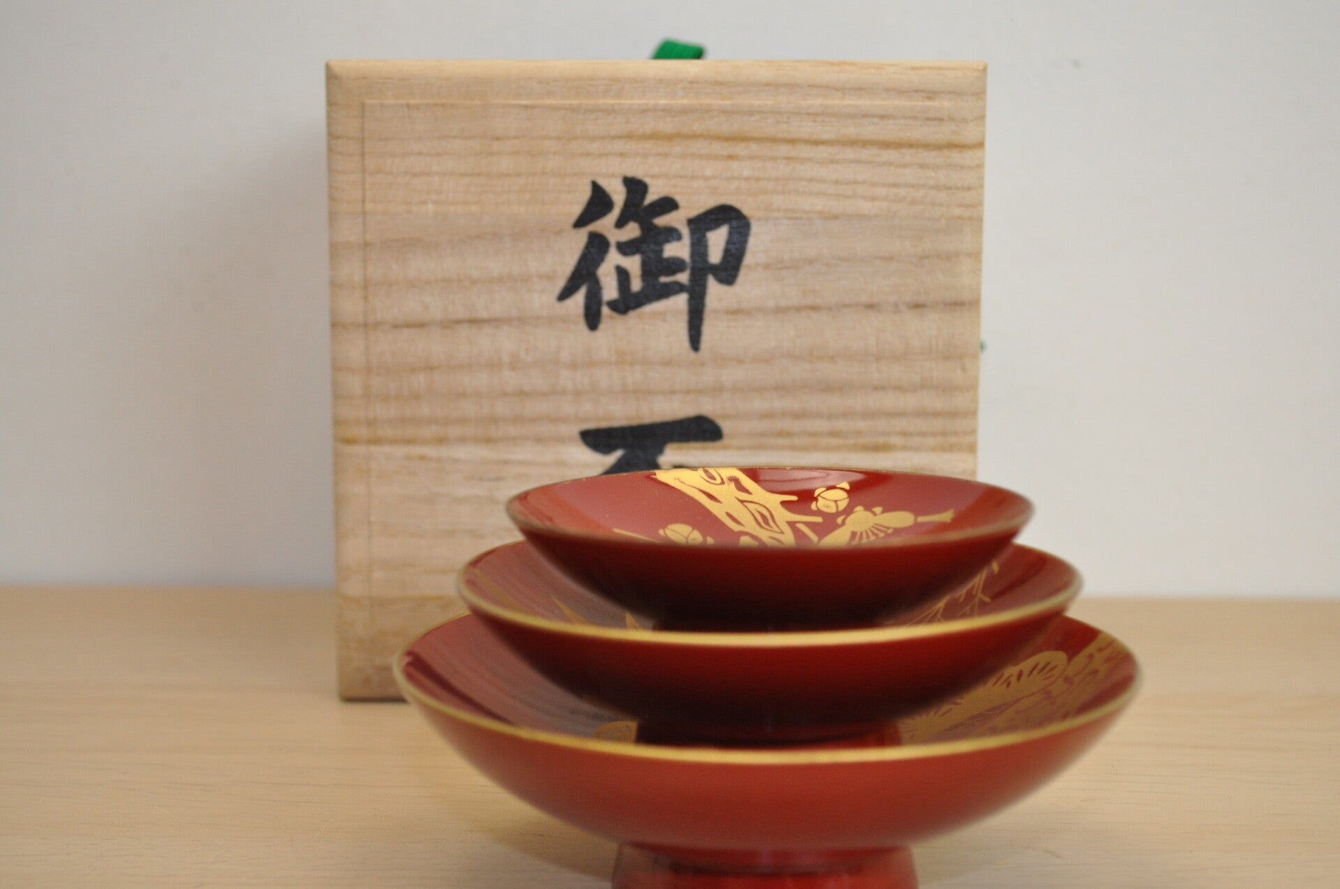 This item is a traditional Japanese sake cup set, beautifully presented in a wooden box. The box is secured with a green cord and bears the kanji characters 御盃 (osakazuki), which means "honorable sake cups." The set includes three red lacquer sake cups of different sizes, each adorned with elegant gold designs representing auspicious motifs in Japanese culture: Pine tree (松 / matsu): Symbol of longevity and resilience. Bamboo (竹 / take): Represents strength and flexibility. Plum blossom (梅 / ume): A sign of perseverance and renewal, as it blooms even in the cold of winter. Together, pine, bamboo, and plum are known as the "Three Friends of Winter" (歳寒三友 / saikan sanyū), a celebrated trio in East Asian art and symbolism, signifying endurance, integrity, and friendship. This set is often used in traditional ceremonies such as weddings, New Year celebrations, or other important occasions, where sake is shared as a gesture of unity and good fortune. Also it is often collected and displayed in curio cabinets or on shelves as part of Japanese cultural décor.