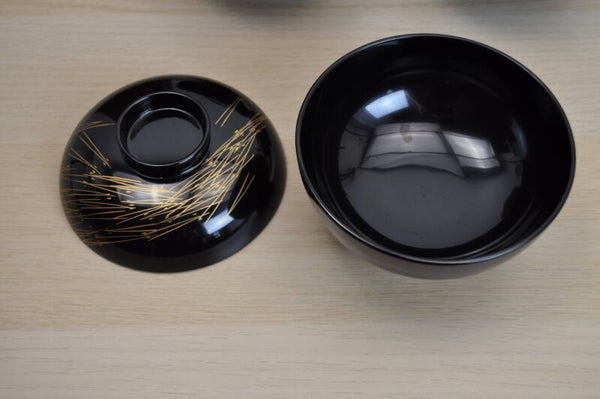 Lacquered bowls used for rice or miso soup in red box.