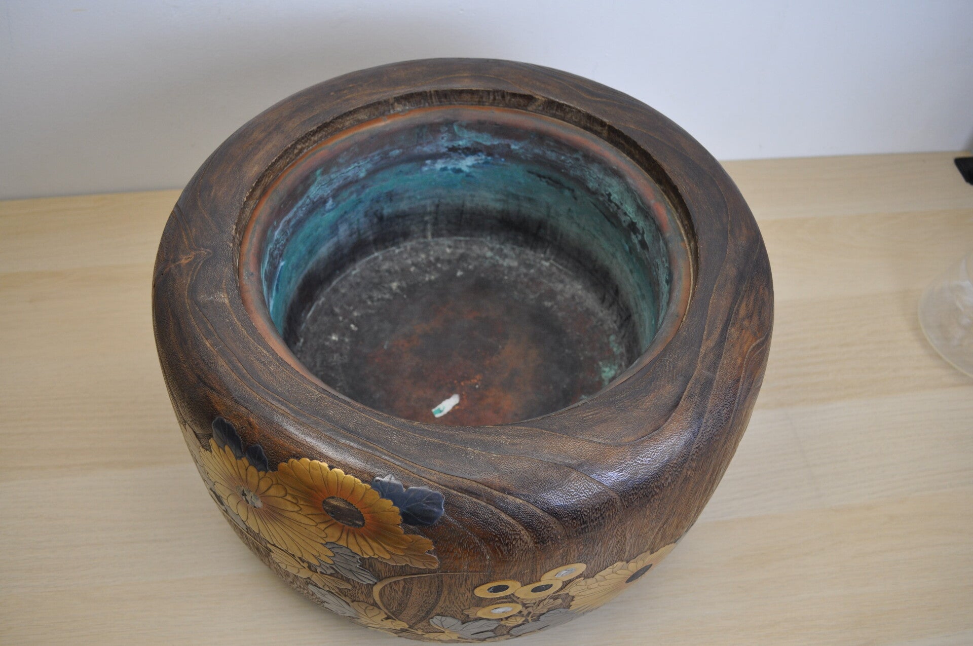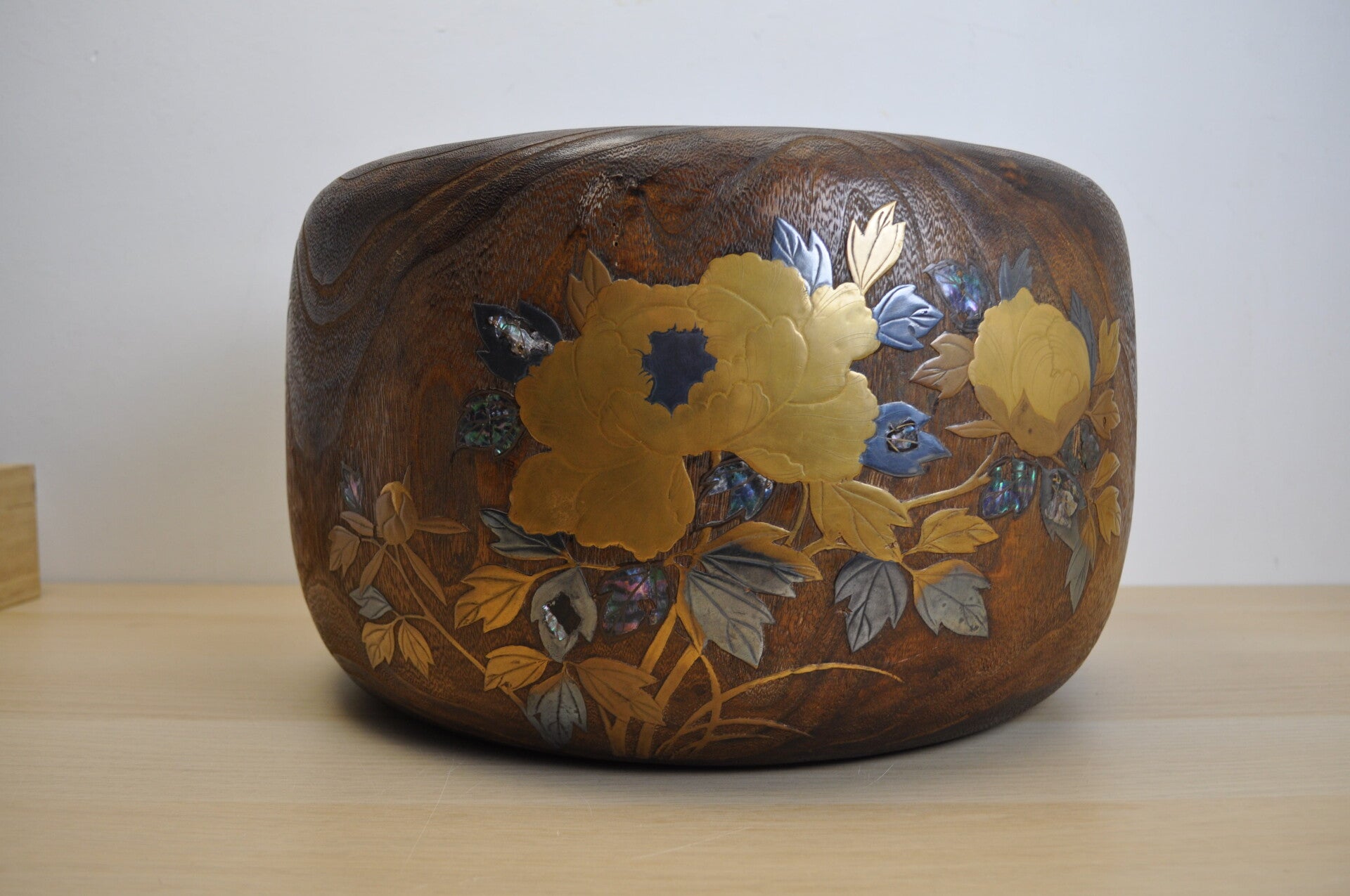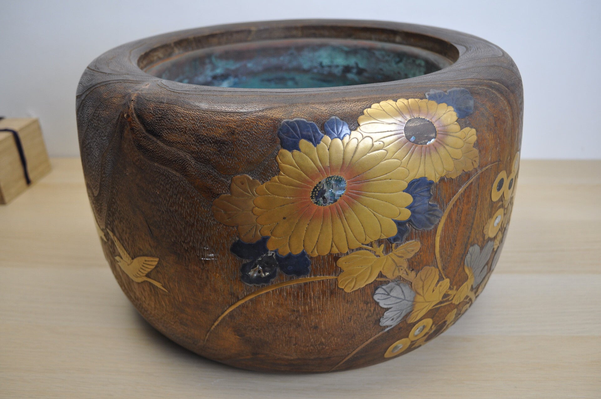 This hibachi is made from paulownia wood with a maki e inlay of flowers and birds.
